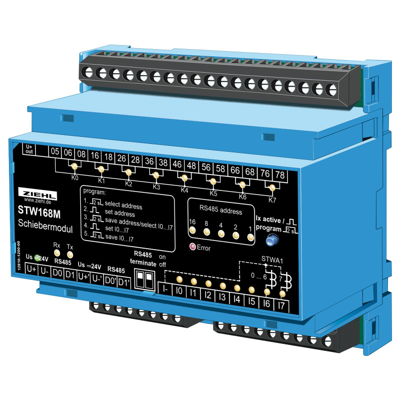 STW168M и STW161M модули за щори управляват до 8 жалузи в аспирационни системи във връзка с блок за управление STW164IP. До 4 модула STW168M могат да се комбинират с един блок за управление STW164IP. Те просто се монтират до STW164IP в контролния шкаф. Като алтернатива те могат да бъдат поставени близо до шибърите. В този случай модулът трябва да бъде свързан само с един шинен кабел. Вече не са необходими дългите захранващи линии към плъзгачите от контролния шкаф. В същото време е възможно да се използват единични модули STW161M в същата система (плъзгачи на STW161M само DC 24 V).