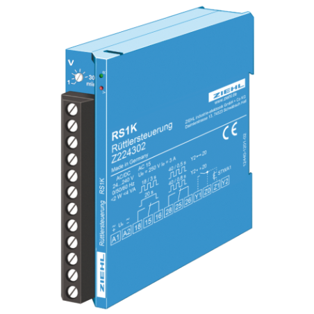 Die Vibratorsteuerung RS1K ist ein kompaktes Mehrfachzeitrelais zur Ansteuerung von Vibratoren in Absauganlagen. Um Absauganlagen optimal betreiben zu können, müssen die durch Sägemehl, Späne oder Staub verstopften Filter regelmäßig durch Vibration gereinigt werden. Der Vibrationsvorgang darf keinesfalls bei laufender Absaugung oder beim Abbremsen des Ventilators durchgeführt werden. Wird während der Vibration mit dem Absaugen begonnen, ist der Vorgang sofort zu unterbrechen. Vor dem Start des Vibrationsvorgangs läuft eine einstellbare Verzögerungszeit, die den Ventilator vor dem Vibrationsbeginn verzögert. Dadurch können kurze Unterbrechungen überbrückt werden, ohne dass jedes Mal eine Vibration durchgeführt werden muss.