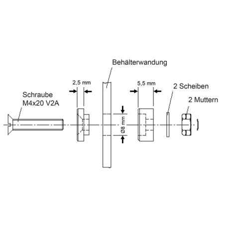 Isolierte Einschraubelektroden zur Montage in Behälterwänden. Die Elektroden bestehen aus Edelstahl (V2A), das Isolationsmaterial ist Teflon.