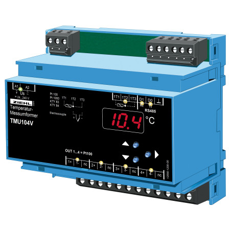 Der Messstellenmultiplikator TMU104V misst die Temperatur an einem angeschlossenen Sensor und wandelt diese in 4 isolierte Signale Pt100 (RTD) um. Über die Schnittstelle RS485 kann es als Simulator für bis zu 4 Pt100-Signale verwendet werden.