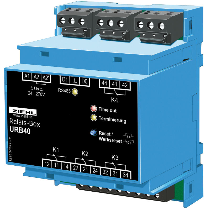 Die Universal-Relaisbox URB40 ist eine Erweiterungsbox für UR-Geräte, mit der bis zu vier zusätzliche Relaisausgänge über Modbus RTU angesteuert werden können. Die URB40 überwacht die Kommunikation zwischen den Geräten und kann jeden Relaisausgang im Falle eines Timeouts in einen vordefinierten Zustand versetzen. Das Gerät besitzt keine Bedienelemente und wird ausschließlich über die RS-485-Schnittstelle gesteuert und konfiguriert.