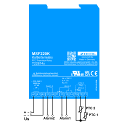 PTC-relay for the monitoring of dry transformers. Alarm 1 with relay in closedcircuit current mode for preliminary warning, releases at over-temperature at PTC-set 1 and serves at the same time as functional monitoring. Alarm 2 in operating current mode. Thus no wiping signal occurs when switching on the supply voltage on. Additional terminals enable comfortable wiring from supply voltage to relays K1 and/or K2.