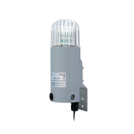 Lámpara LED universal de advertencia y señalización para uso en interiores y exteriores. Carcasa robusta, IP66, montada en un soporte de pared de acero inoxidable.