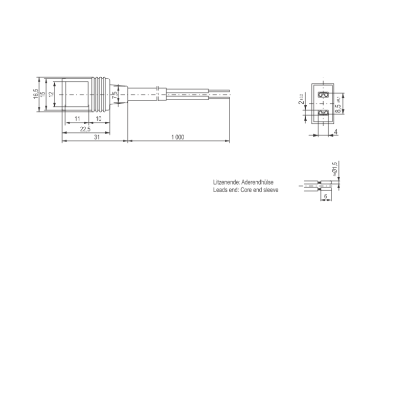 Kábel öntött csatlakozóval, többféle hosszúságban kapható. A huzalvégek krimpelő érvéghüvellyel, krimpelt érvéghüvellyel vagy ónozott érvéghüvellyel vannak ellátva. Egyenes vagy ferde dugó. Minden ventilátortípushoz 2,8/3,0 x 0,5 lapos dugóval.