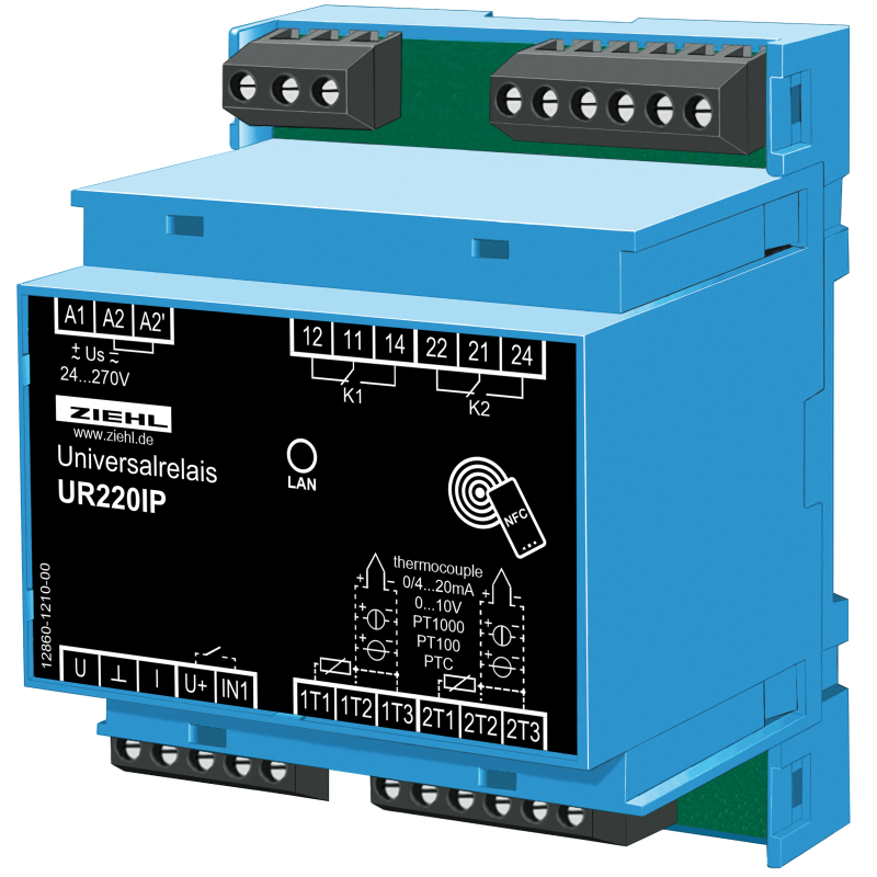 Az UR220IP üzemeltethető NFC-n keresztül vagy normál PC-ről, megfelelő böngészővel. Ezenkívül minden érték és állapot lekérdezhető a Modbus TCP-n keresztül. Az eszköz egyidejűleg akár 2 különböző bemeneti jelet is képes kiértékelni és felügyelni. A 2 kimeneti relé mindegyikéhez legfeljebb 2 határérték rendelhető, bemenetenként egy. Ha elér egy határértéket, riasztás indul, és egy relé kapcsol. A készülék analóg árammal és analóg feszültségkimenettel rendelkezik. A relék a digitális bemeneten keresztül is be- és kikapcsolhatók.