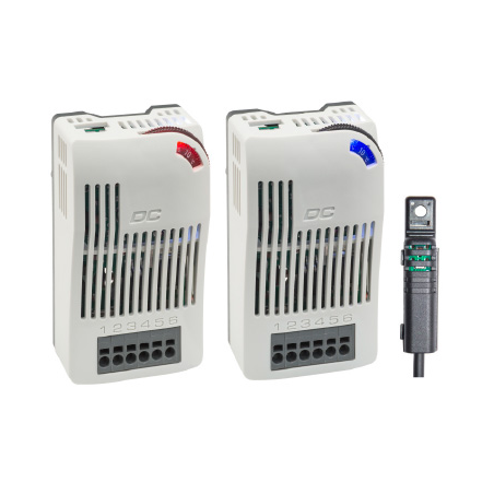 Elektroninis termostatas su integruotu perjungimo moduliu, skirtas nuolatinės srovės įrenginiams valdyti elektros gaubtuose ir spintelėse. Perjungia visas įprastas apkrovas elektros korpusuose: šildytuvus, ventiliatorius, signalų siųstuvus ir kt. Dvi normaliai uždarytų (NO) kontaktų versijos siūlo platų temperatūros nustatymo diapazoną. Paprastai atviros (NC) versijos turi antrinę perjungimo funkciją: fiksuota 65 % rH.