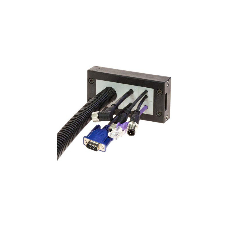 The DES 16M splittable frame allow up to 32 cables with or without connector or one or two cables up to 35mm diameter to pass through electric cabinet or machines walls. The small and big grommets can be freely positioned inside the frame.