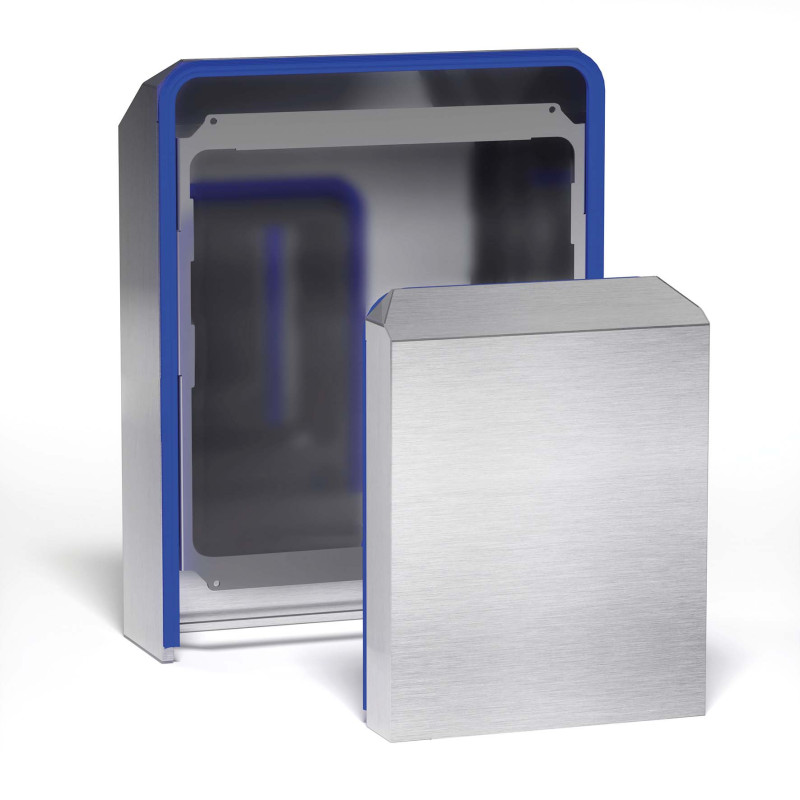 Pokrywa ze stali nierdzewnej (AISI 304) z uszczelką zgodną z wymogami FDA, przeznaczona do filtrów wyciągowych i wentylatorów filtrujących, chroniąca wewnętrzne elementy panelu elektrycznego przed strumieniami wody i wnikaniem ciał stałych, co podnosi stopień ochrony do IP56. Idealna do zastosowań o wysokich standardach higienicznych w sektorze spożywczym i na zewnątrz. Dostępna również w wersji ze stali malowanej proszkowo w kolorze RAL 7035. Patent w toku.