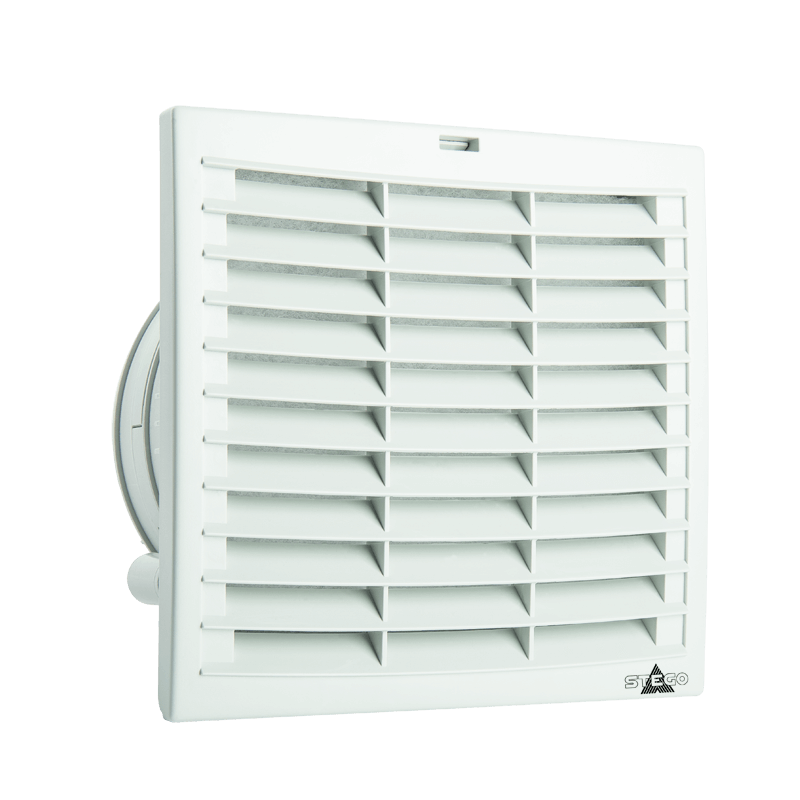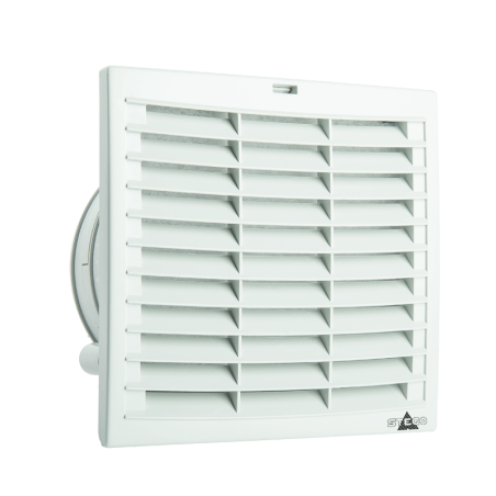 Wentylator z filtrem FPI rozmiar 4 (223 x 223 mm) do klimatyzacji obudów elektrycznych i obudów. Konfiguracja: FPI - kierunek przepływu powietrza IN (wersja standardowa: dmuchanie). Optymalna klimatyzacja obudowy: Wentylator z filtrem Plus dmucha chłodniejsze powietrze z zewnątrz do obudowy elektrycznej. Cieplejsze powietrze wewnątrz obudowy jest odprowadzane przez filtr wyjściowy. Powstały strumień powietrza chłodzi obudowę elektryczną i stycznikiem chroni komponenty przed przegrzaniem.