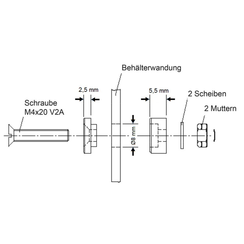 Electrozi izolați cu șuruburi pentru montarea în pereții rezervoarelor. Electrozii sunt fabricați din oțel inoxidabil (V2A), materialul izolator este Teflon.