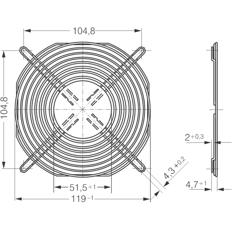Защитная решетка подходит для вентиляторов размером 119 x 119 мм