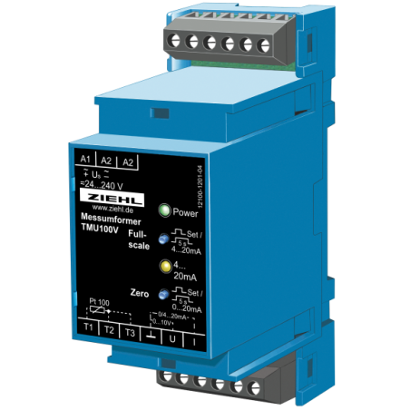 <п>Модел ТМУ100 Пт100 мерни претварачи су погодни за мерење температуре са Пт100 сензорима (РТД). Нула и пуна скала могу се слободно подесити у целом опсегу -199 ...+850 °Ц. Да бисте то урадили, повезани су само отпорници одговарајуће вредности или Пт 100-декаде. Подешавање се врши притиском на дугме.<п>Уграђено универзално напајање АЦ/ДЦ 24-240 В омогућава повезивање на све уобичајене напоне напајања. Пт100- сензор се може повезати у 2- или 3-жичну везу. Излаз истовремено испоручује 0/4 ... 20 мА и 0 ... 10 В.<п>Преглед функција<ул><ли>Пт100-улаз 2- или 3-жична аутоматска компензација линије до 500 О укупног отпора (сензор + линија)<ли>Откривање потпуног притиска сензора ><ли->Еро. а дугме<ли>Широк опсег мерења -200... +850 °Ц<ли>ЛЕД за приказ радног стања<ли>Аналогни излаз 0 ... 20 мА / 4 ... 20 мА. Аналогни излаз 0 ... 10 В<ли>Кућиште за ДИН шину или зидну монтажу, ширина 35 мм, висина монтаже 55 мм<ли>Универзално напајање АЦ/ДЦ 24-240 В