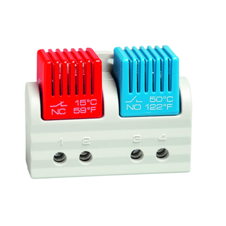 Фіксований нормально закритий (NC) контакт термостата та нормально відкритий (NO) контакт термостата в одному корпусі. На відміну від термостатів з перемикаючими контактами, подвійний термостат перемикається незалежно. Це дозволяє перемикати пристрої опалення та охолодження в різних діапазонах температур.